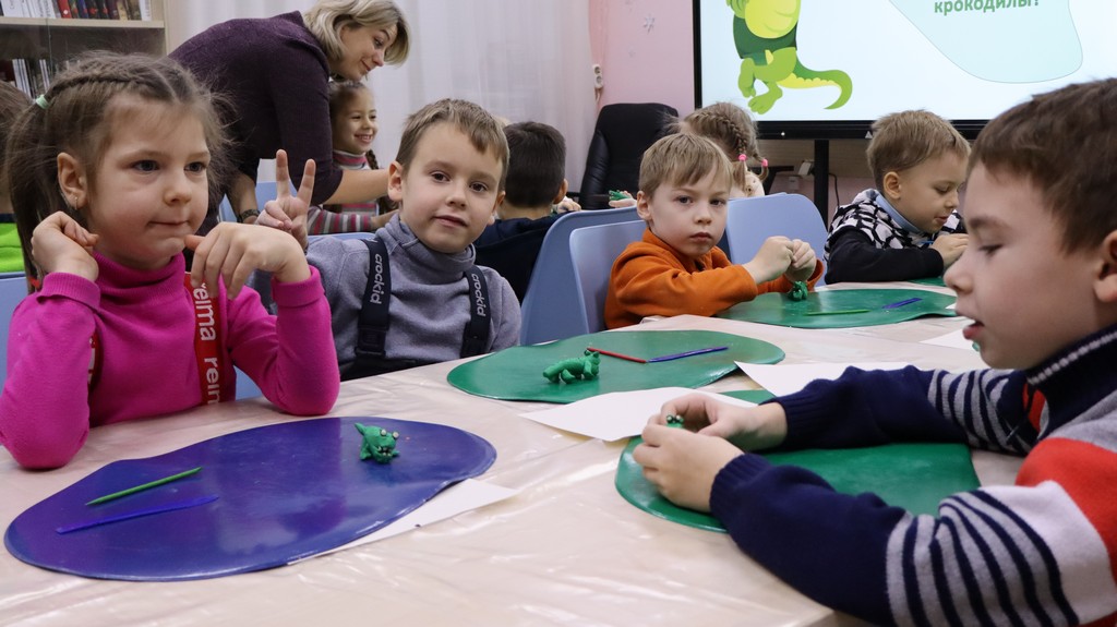 Очередная встреча началась с прочтения стихотворения К.И. Чуковского «Краденое солнце», ведь занятие было посвящено крокодилу. На уроке ребята узнали, чем крокодил отличается от аллигатора и гавиала. Параллельно с получением новой информации дети лепили крокодила.