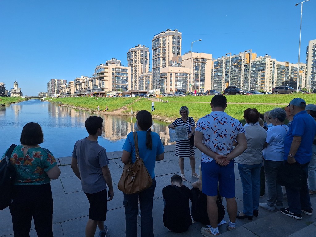Началась прогулка у административного корпуса микрорайона. Мы подошли к скульптурной группе «Семья», а затем к закладному камню, с которого началось освоение этой территории. Далее мы зашли в административный корпус, чтобы осмотреть макет Балтийской жемчужины, на котором хорошо видно, в каком живописном месте расположен микрорайон. У Матисова канала мы вспомнили о клубе «Балтиец», который в течение нескольких десятилетий находился на его берегах.