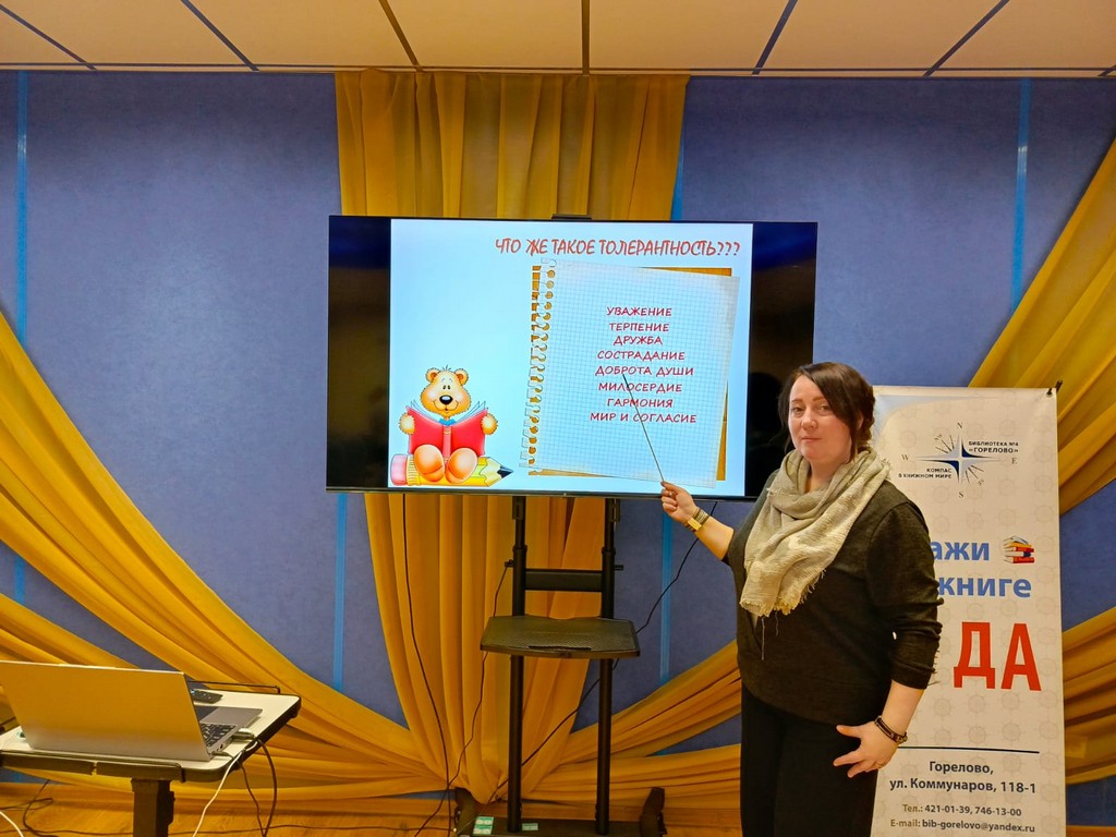 Ведущая рассказала, что такое толерантность и как она может проявляться в обществе, также о том, что каждый из нас учится дружить с ранних лет, мы стараемся помочь себе и своим близким в разных ситуациях, стремимся к сохранению мира и согласия на земле.