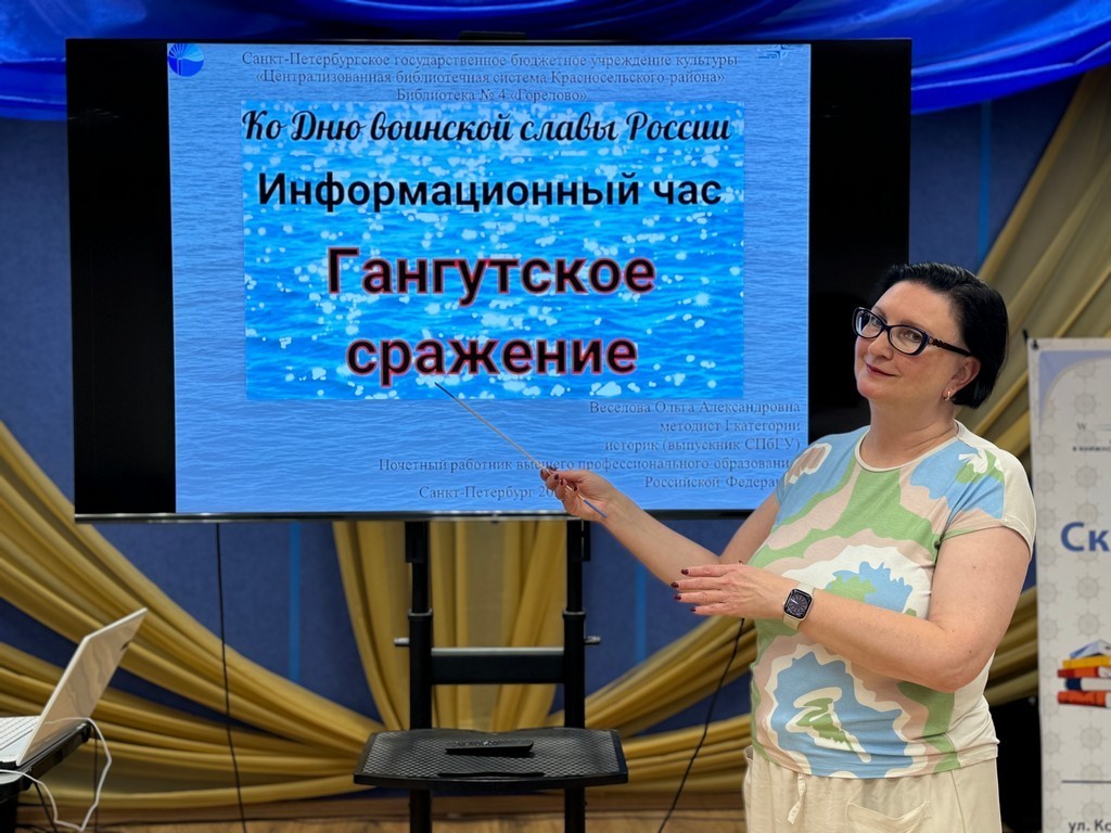 4 августа 2024 года в библиотеке № 4 «Горелово» для посетителей прошел информационный час «Гангутское сражение» к 310-летию первой в российской истории морской победы русского флота под командованием Петра I над шведами. Мероприятие подготовил сотрудник Ольга Александровна Веселова, историк, Почетный работник высшего профессионального образования Российской Федерации.