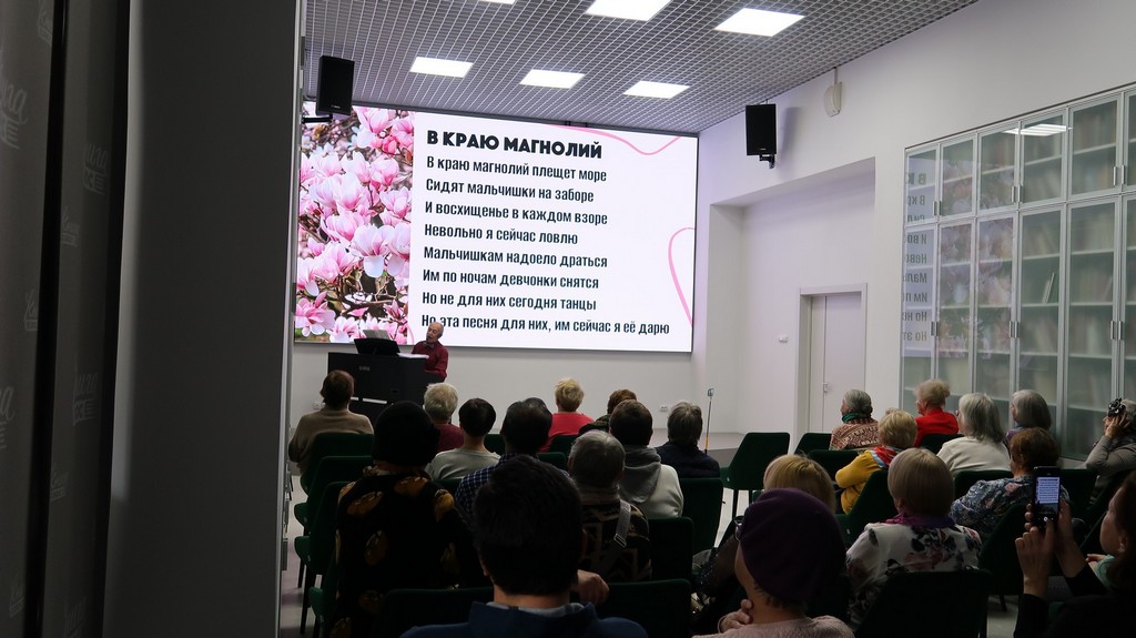 Для удобства на экране были выведены тексты песен. Читатели с удовольствием пели их вместе с ведущим.