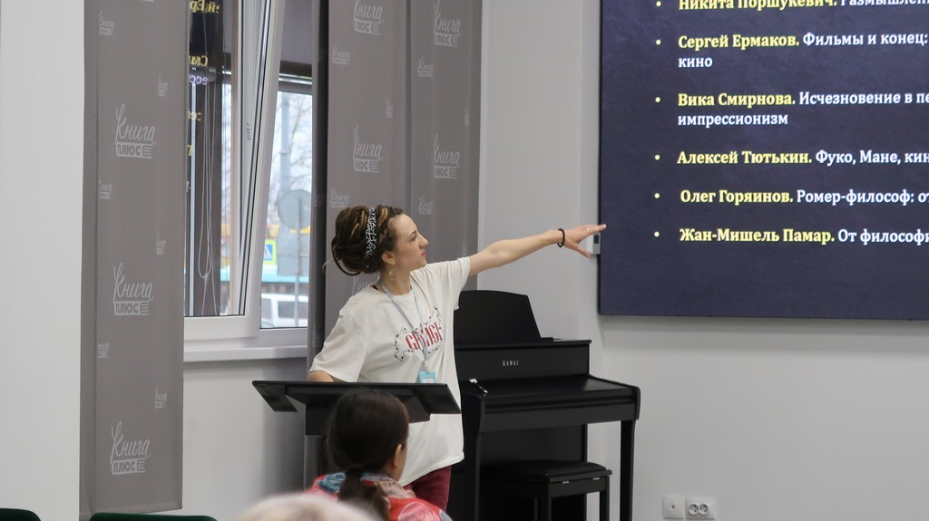 Слушатели смогли увидеть фрагменты фильмов и познакомиться с книгами и статьями, посвященными философским идеям в кинематографе.