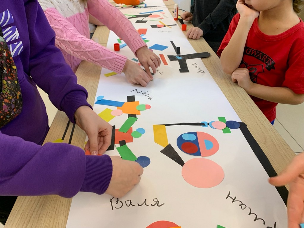 Правильно уловив идеи В. Степановой, юные мастера сделали две групповые творческие работы. Вдохновением послужили серия ее знаменитых полотен «Фигуры» и плакаты беспредметной поэзии.