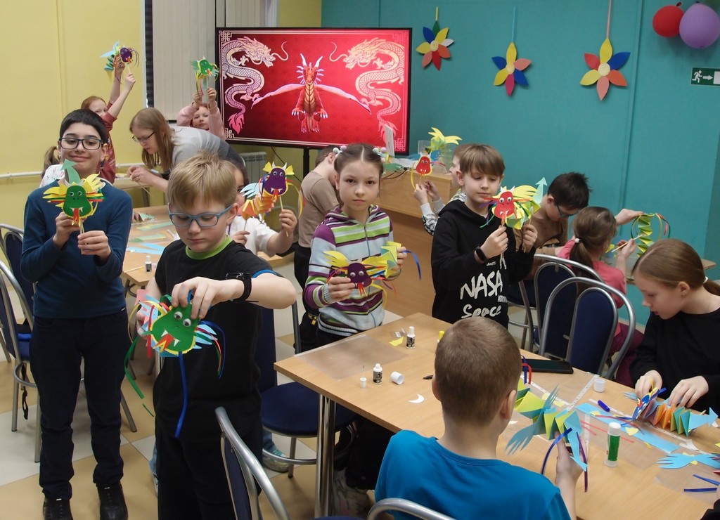 Празднование Нового года давно завершилось, но почему бы весной не вспомнить о годе Дракона? В дни школьных каникул ребята собрались в библиотеке, чтобы смастерить из цветной бумаги и деревянных палочек необычную игрушку и узнать о китайских традициях, легендах и сказках. А драконы у всех участников получились яркие и добрые!