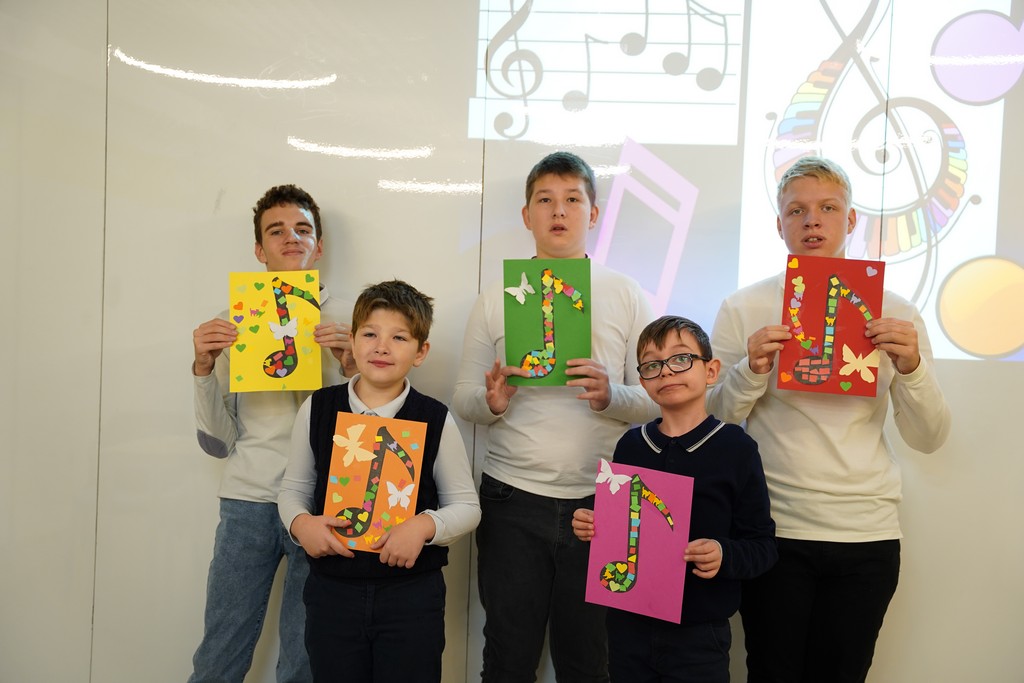 После небольшой лекции-концерта, учащиеся приступили к практической работе. Ребята сделали яркую аппликацию в виде ноты, которую украсили разноцветными акцентами из небольших квадратиков, сердечек, треугольников и котиков.