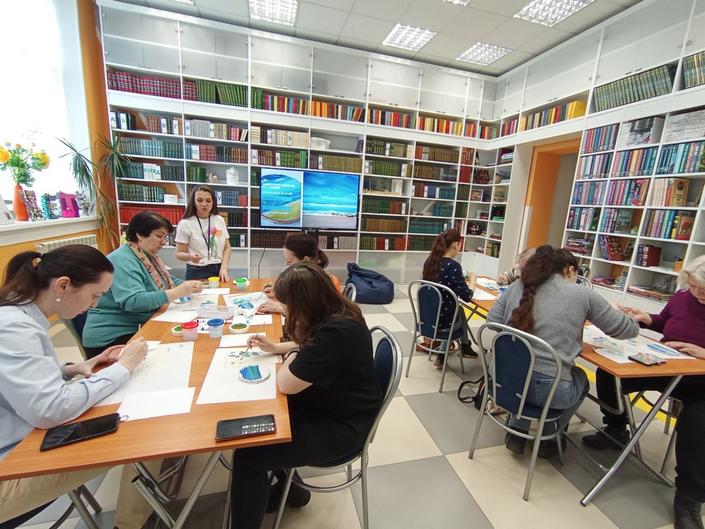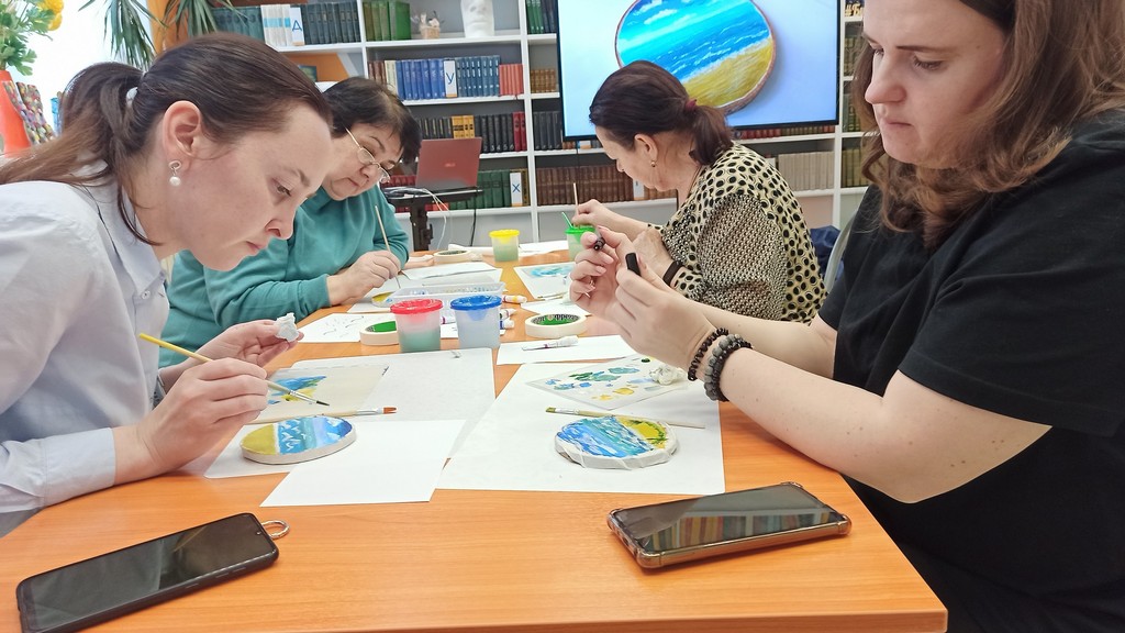 Библиотека продолжает знакомить пользователей с различными видами живописи. Участники творческого мастер-класса попробовали свои силы в технике рисования акриловыми красками. Тема рисунка – романтичный морской пейзаж. Ведущий познакомила участников с основами живописи акриловыми красками и особенностями техники работы с красками и кистью. Изображение наносили на спил дерева. Участники мастер-класса нарисовали эмоциональные и нежные рисунки.