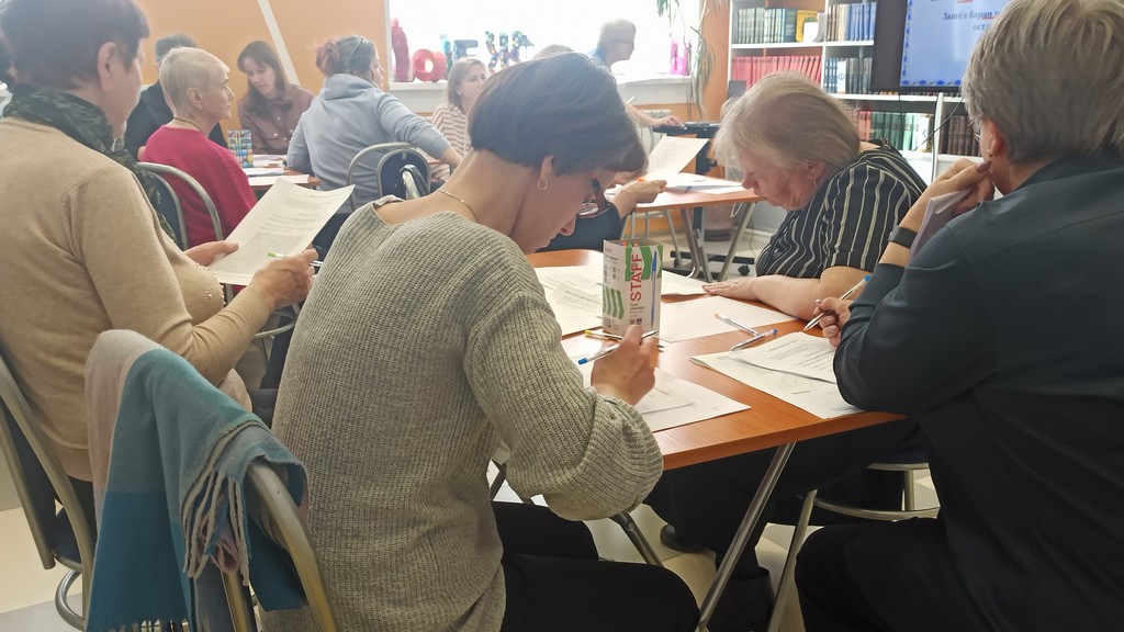 В ходе встречи участники выполнили упражнения, способствующие активизации интеллектуальной деятельности. Например, практиковали рисование и письмо двумя руками. Оба полушария мозга работают одновременно, повышается продуктивность, формируются новые нейронные связи и улучшается самочувствие. Далее провели тренировку вербального интеллекта: писали синквейны – нерифмованные стихотворения из пяти строк, которые помогают выражать мысли ясно, точно и образно. На мастер-класс были созданы оригинальные пятистишья на тему «Библиотека». Большой интерес вызвали пальчиковая и суставная гимнастика, а также анаграммы, файнворды, филворды, связанные с именами. Самым сложным заданием стало зеркальное письмо справа налево, которое является отличной профилактикой Альцгеймера.