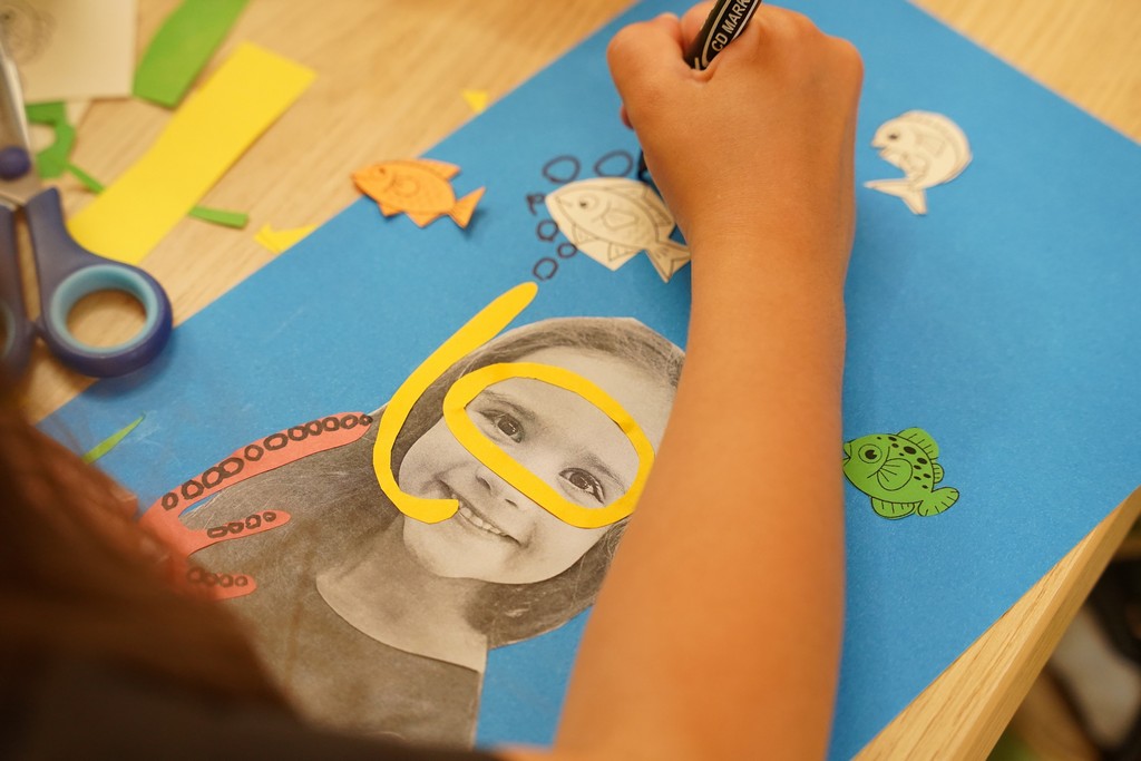 В завершении урока, участники пофантазировали и представили себя под водой с аквалангом, в окружении морских животных. В технике коллаж, ребята смастерили уникальную творческую работу со своей фотографией, которую сделали и распечатали прямо на занятии.
