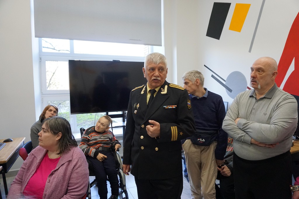 В преддверии Дня Победы советского народа в Великой Отечественной войне 1941-1945 годов получатели социальных услуг ГБСУСО «ПНИ № 7» и учащиеся 4 класса ГБОУ Начальная школа-детский сад № 678 встретились с морским офицером и художником-маринистом. Тимур Назифович провел экскурсию по персональной выставке и рассказал